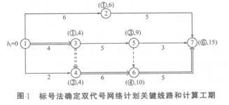 用標(biāo)號(hào)法確定雙代號(hào)網(wǎng)絡(luò)計(jì)劃關(guān)鍵線路和計(jì)算工期如圖1所示。
