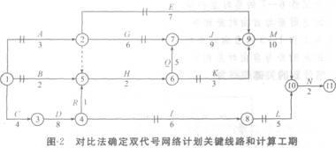 用對(duì)比法確定雙代號(hào)網(wǎng)絡(luò)計(jì)劃關(guān)鍵線路和計(jì)算工期如圖2所示。