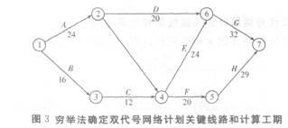 用窮舉法確定雙代號(hào)網(wǎng)絡(luò)計(jì)劃關(guān)鍵線路和計(jì)算工期如圖3所示。