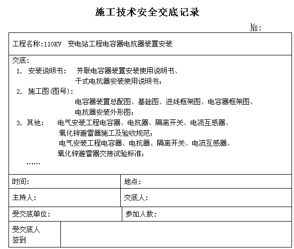 電容器電抗器裝置安裝 施工技術(shù)安全交底記錄