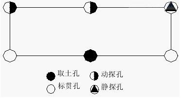 強(qiáng)夯結(jié)束兩周后對強(qiáng)夯地基進(jìn)行檢測,檢測手段采用鉆探、原位測試方法。檢驗(yàn)深度大于設(shè)計(jì)有效加固深度,每棟建筑檢測6點(diǎn),勘探點(diǎn)平面布置見圖2。