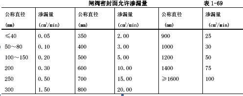 3.12.2.5除蝶閥、止回閥、底閥、節(jié)流閥外的閥門,嚴(yán)密性試驗(yàn)一般應(yīng)以公稱壓力進(jìn)行,在不能夠確定公稱壓力時(shí),也可用1.25倍的工作壓力進(jìn)行試驗(yàn),以閥瓣密封面不漏為合格。公積壓力小于或等于2.5MPa的給水用的鑄鐵、鑄銅閘閥允許有不超過表1-69的滲漏量。