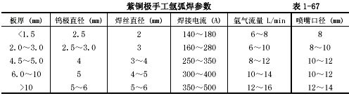 3.8.5紫銅鎢極氬弧焊參數(shù)如表1-67。