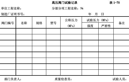 3.12.2.12試驗(yàn)合格的閥門,應(yīng)及時排盡內(nèi)部積水,密封面應(yīng)涂防銹油(需脫脂的閥門除外),關(guān)閉閥門,封閉出入口。高壓閥門應(yīng)填寫“高壓閥門試驗(yàn)記錄”(表1-70)。