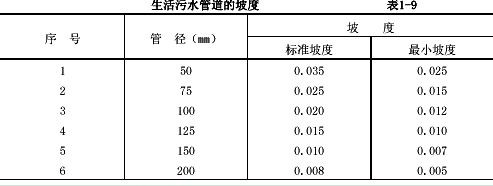 6.6排水管道坡度過小或倒坡,均影響使用效果,各種管道坡度必須按設(shè)計要求找準,如設(shè)計無要求時,可參照表1-9的要求進行安裝。