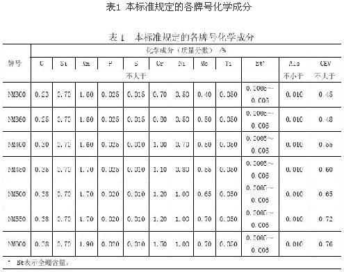 。2)合金元素及含量:本標準合金元素除C、Mn、Si之外,還采用Cr、Mo、B、Ni等作為主要合金元素。確保材料具有良好的淬透性、淬硬性和綜合力學性能,主要目的是提高鋼的耐磨性。Ti的加入可起到細化晶粒的作用。本標準重點參考了日本、瑞典、德國等企業(yè)標準的成分設計。