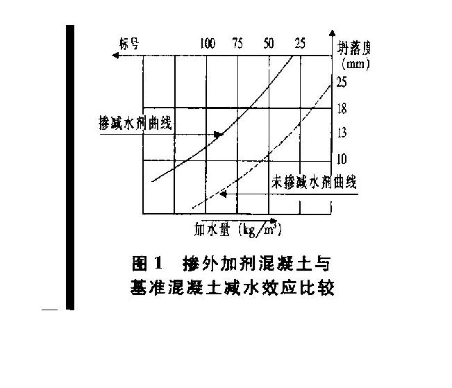 在本工程施工中,地下室底板使用KFDN-SP8外加劑,看臺樓層等混凝土結(jié)構(gòu)根據(jù)具體情況,選用HPM一2高效緩凝減水劑、FE-C2外加劑等,這些高效外加劑具有高減水率和良好的保塑性能。摻外加劑混凝土與基準混凝土的減水效應比較如圖1所示。