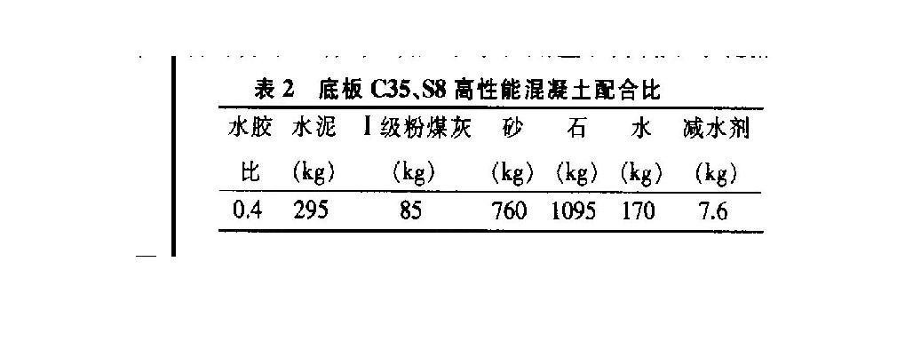 、芡ㄟ^試驗選定收縮率較小的配合比。為了確;炷辆哂懈咝阅,我們提前對混凝土配合比進行了大量反復多次的試驗,取得十幾組試配數(shù)據(jù),測試了不同配合比混凝土的收縮率及收縮與齡期的關(guān)系,并采用鋼環(huán)試驗方法測試混凝土的長期收縮情況。測定混凝土收縮率后,有意識地模擬澆筑一塊混凝土試件進行試驗,測試其溫度變化和收縮率,確定了表2的配合比,其收縮率為0.12%,且在14d后基本上不再收縮。實踐證明,本配合比是成功的,用I級粉煤灰代替部分水泥,大大減少了水泥用量和降低了水化熱,在確定了收縮率較小的配比后,據(jù)此收縮率確定底板分塊的最大長度為45m,相鄰塊之間混凝土澆筑的時間間隔為14d。