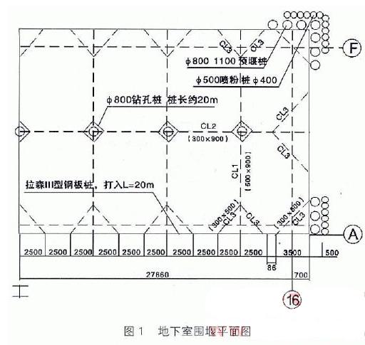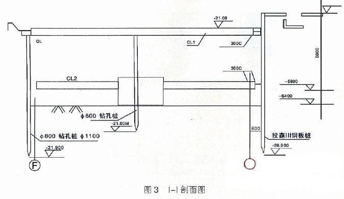 通過(guò)對(duì)多種方案綜合分析,最后確定地下室基坑南面采用拉森Ⅲ型鋼板樁圍護(hù),其余三面采用鉆孔樁φ800、φ1100圍護(hù),鉆孔樁外側(cè)采用φ500、φ400噴粉樁聯(lián)成止水帷幕。鉆孔樁除基坑底為-7.35m部分采用兩層水平支撐外,其余鉆孔樁均采用一層水平支撐設(shè)計(jì),鋼板樁采用兩層水平支撐設(shè)計(jì)。第一層支撐體系采用鋼筋混凝土梁(其中鋼板樁仍使用HK300C工字鋼作腰梁,節(jié)點(diǎn)利用焊接鋼筋錨入支撐混凝土中),中間設(shè)φ800鉆孔支承樁。第二層支撐體系采用HK300C工字鋼。由于部分基礎(chǔ)承臺(tái)阻擋節(jié)在二層支撐的支撐樁上,考慮到不能拖延加設(shè)支撐的時(shí)間,因而先加設(shè)支撐,然后支撐與承臺(tái)混凝土一起澆筑(見(jiàn)圖2、圖3)。