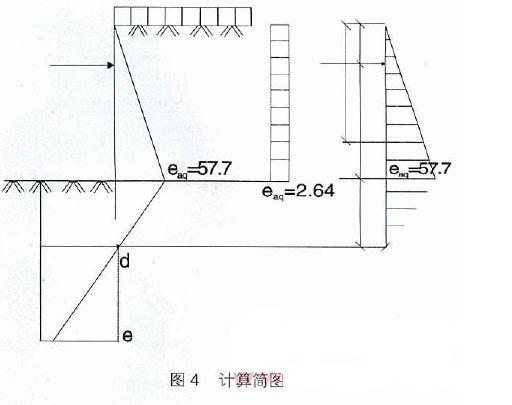 4.1.1r、Ck、ψk按20m范圍內(nèi)的加權(quán)平均值計(jì)算,求得:r=15.9Kn/m,ψk=120;主動(dòng)土壓力系數(shù)Ka=tg2(45-12/2)=0.66;被動(dòng)土壓力系數(shù)Kp=tg2(45+12/2)=1.52;查表得K=1.28;eAh=rhKa=15.9×5.5×0.66=57.7kN/m2;eAq=qKa=2.64kN/m2;計(jì)算簡(jiǎn)圖見(jiàn)圖4.