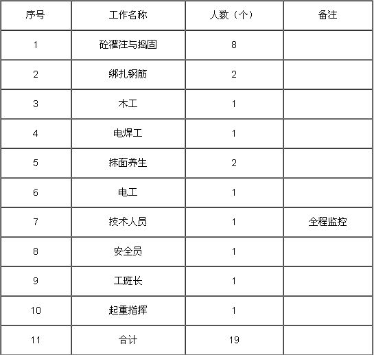 施工前對施工中勞力進行技術培訓,安全教育,并對其進行優(yōu)化組合,保證施工進度。(如:表1)