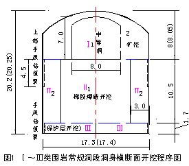 常規(guī)洞段即I、II、III類圍巖段橫斷面開挖程序見圖1: