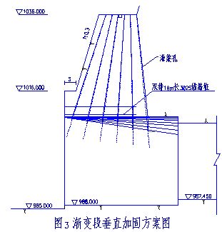 2)由于漸變段跨度大,大半部分頂部平直,僅兩側(cè)起拱,開挖后圍巖難以自穩(wěn),所以頂部除了灌漿加固外,擬采用懸吊錨筋樁從上部將洞頂拉住,具體方法如下: