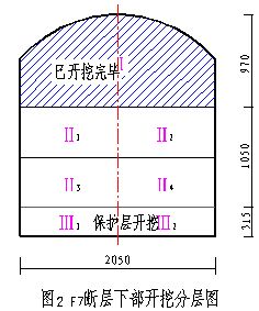 F7斷層部位開挖斷面為20.5×23.35的城門洞型,F(xiàn)7段層破碎帶縱向開挖程序與一般洞段開挖相適應(yīng)分三層開挖:第一層開挖高度9.70m,第二層開挖高度10.5米,第三層開挖高度3.15米。
