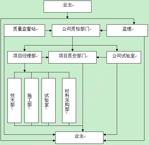 由業(yè)主、建設(shè)行政主管部門的質(zhì)量監(jiān)督機(jī)構(gòu)、公司質(zhì)檢部門、監(jiān)理、項(xiàng)目部的技術(shù)部、施工部、試驗(yàn)室、材料采購部與項(xiàng)目部的質(zhì)量安全部、公司的試驗(yàn)室組成項(xiàng)目的質(zhì)量檢測機(jī)構(gòu),負(fù)責(zé)對項(xiàng)目的質(zhì)量進(jìn)行檢測,同時(shí)由業(yè)主牽頭,由建設(shè)、設(shè)計(jì)、監(jiān)理、勘察、施工五部門組成一個(gè)質(zhì)量驗(yàn)收機(jī)構(gòu),負(fù)責(zé)項(xiàng)目的中間和交付驗(yàn)收。