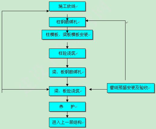 測量彈線→柱鋼筋綁扎→梁柱模→柱砼→梁板模板安裝→梁板鋼筋綁扎→梁板砼→養(yǎng)護(hù)→砌體