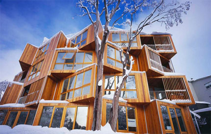 Huski的設(shè)計來源于用幾何學(xué)對雪花結(jié)構(gòu)的研究。現(xiàn)今純粹的聯(lián)合體式樣和澳大利亞木材建造的棚屋相結(jié)合。擁有著自然光線,建筑靈敏的反應(yīng)著周圍的環(huán)境,它充分利用了陡峭的位置,使每個公寓的居住者能夠最大化的看到Kiewa valley和Mt Spion Kopje的景觀。北面被調(diào)整后的位面在計劃和高度上都強(qiáng)調(diào)著建筑的動態(tài)品質(zhì)。而使用舊的木材原料巧妙的暗示著建筑和當(dāng)?shù)亟ㄖ愋偷拿芮嘘P(guān)系。