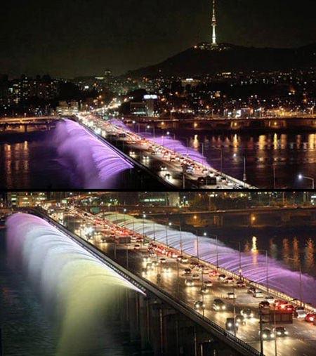 韓國首爾的盤浦噴泉大橋橫跨漢江,是當(dāng)?shù)氐闹饕^光景點(diǎn)。在2008年的擴(kuò)建工程中,在橋的兩側(cè)安裝了9380個(gè)噴泉口,噴水量達(dá)到每分鐘190噸。夜間,在特別照明設(shè)備的映襯下,大橋兩側(cè)五顏六色的噴泉使人仿佛穿越時(shí)空,步入夢幻國度,美不勝收。