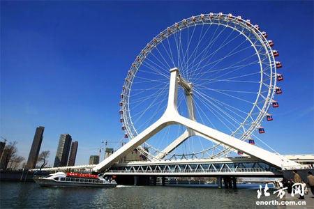 位于天津的永樂橋,兼具交通和觀光功用,橫跨海河,它的特別之處在于橋上矗立著一個(gè)名為“天津之眼”的高大雄偉的觀光摩天輪,輪外裝掛著共48個(gè)透明觀光艙,每個(gè)觀光艙可容納8人,可供384人同時(shí)觀光,游客乘坐摩天輪最高可達(dá)到120米的高空,盡享天“輪”之樂。
