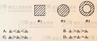 6、三根桿件,截面面積、桿件長度、材質(zhì)均相同,截面形狀如下圖所示,當(dāng)桿件兩端受相同的軸向拉力時(shí)各桿件的伸長量分別為Δ1、Δ2、Δ3,關(guān)于三者的關(guān)系,以下哪一種正確?( )
