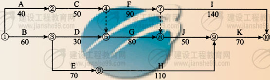 ?。ㄋ模?br /> 1、圖示網絡工期為320d,關鍵線為:A-C-F-I。