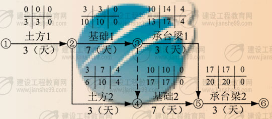 某辦公樓工程,建筑面積5500㎡,框架結構,獨立柱基礎,上設承臺梁,獨立柱基礎埋深為1.5m,地質勘察報告中地基基礎持力層為中砂層,基礎施工鋼材由建設單位供應?;A工程施工分為兩個施工流水段,組織流水施工,根據(jù)工期要求編制了工程基礎項目的施工進度計劃,并繪出施工雙代號網(wǎng)絡計劃圖,如下圖所示: