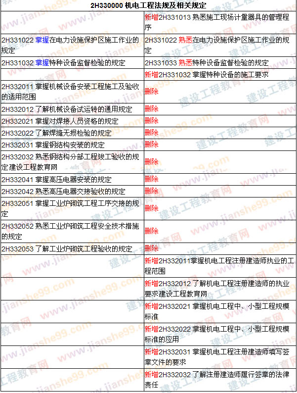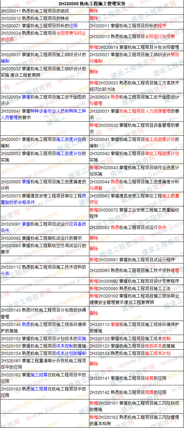 2009年版《機(jī)電工程管理與實(shí)務(wù)》大綱與教材的內(nèi)容相比較2008年版變化較大,主要表現(xiàn)在對(duì)原有章節(jié)進(jìn)行了重新分類調(diào)整,如2H310000 機(jī)電工程技術(shù)章節(jié)中將原來的2H312000機(jī)電工程安裝技術(shù)分解成2H3120002 建筑機(jī)電工程施工技術(shù)和2H313000工業(yè)機(jī)電工程施工技術(shù),將起重技術(shù)和焊接技術(shù)調(diào)整到2H311000 機(jī)電工程專業(yè)技術(shù)中;刪除了一些章節(jié),如機(jī)械傳動(dòng)與技術(shù)測量、電路與電氣設(shè)備等;對(duì)原有的知識(shí)點(diǎn)掌握和熟悉的要求進(jìn)行了調(diào)整,如2H320053 掌握機(jī)電工程項(xiàng)目施工進(jìn)度偏差的分析變更為2H320044 熟悉機(jī)電工程項(xiàng)目施工進(jìn)度偏差分析與調(diào)整;又增加了一些新的知識(shí)點(diǎn),如2H320092 掌握機(jī)電工程項(xiàng)目設(shè)計(jì)變更程序、2H320023 熟悉機(jī)電工程項(xiàng)目施工方案技術(shù)經(jīng)濟(jì)比較方法等;在2H332000 機(jī)電工程相關(guān)規(guī)定中將原來的相關(guān)規(guī)范內(nèi)容變更為注冊建造師的相關(guān)管理規(guī)定。