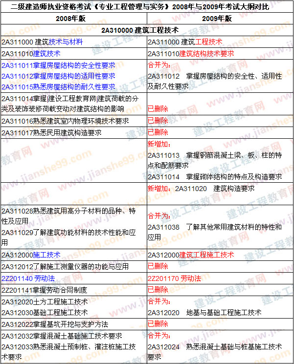 二級建造師《建筑工程專業(yè)》2009年大綱部分內(nèi)容進行了壓縮及調(diào)整,例如“建筑工程技術(shù)要求”改為三部分,“建筑工程施工技術(shù)”由原7部分內(nèi)容降為了6部分。雖然有許多知識點很重要,但作為考點并不適宜。因此,對不能作為考點的知識進行了合并、刪減。