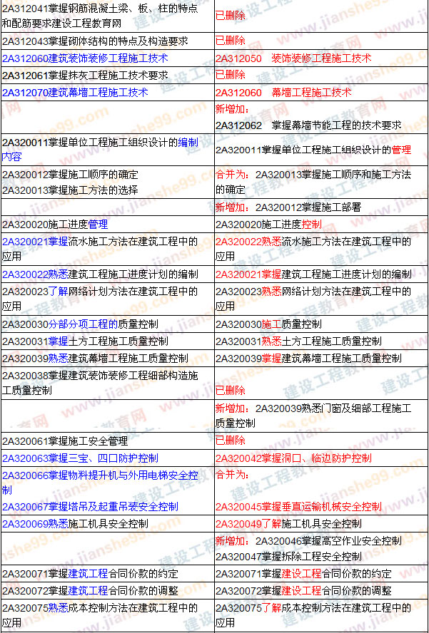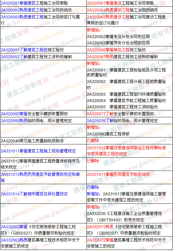 6)將“單位工程竣工驗收”由“了解”提高到“掌握”;“建筑工程竣工資料的編制”由“了解”提高到“熟悉”