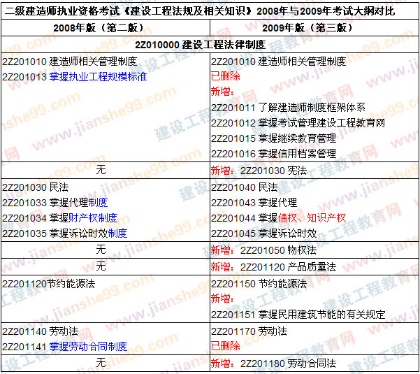 2009年版《建設(shè)工程法規(guī)及相關(guān)知識(shí)》大綱與教材的內(nèi)容相比較2008年版變化不是很大,但也在考試內(nèi)容上做了一些調(diào)整,如刪除了建設(shè)工程法律制度中刪除了執(zhí)業(yè)工程規(guī)模標(biāo)準(zhǔn)章節(jié),新增了建造師制度框架體系、建造師考試管理、繼續(xù)教育管理、信用檔案管理等,也新增了憲法相關(guān)知識(shí)點(diǎn),并把代理制度的考核點(diǎn)轉(zhuǎn)變?yōu)閷?duì)代理知識(shí)的考核,而對(duì)財(cái)產(chǎn)權(quán)制度的考核轉(zhuǎn)變?yōu)閷?duì)債券、知識(shí)產(chǎn)權(quán)的考核等。來源建設(shè)工程教育網(wǎng),轉(zhuǎn)載請(qǐng)注明出處!