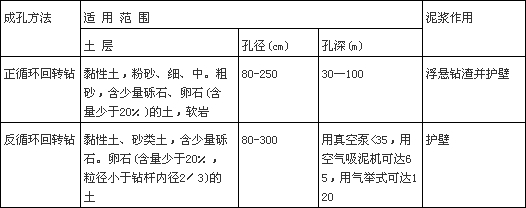 常用成孔方法:正循環(huán)回轉(zhuǎn)鉆,反循環(huán)回轉(zhuǎn)鉆。見表2K312022.