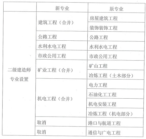四、自2008年起,二級(jí)建造師資格考試報(bào)名均應(yīng)按照調(diào)整后《專業(yè)工程管理與實(shí)務(wù)》科目的專業(yè)類別進(jìn)行。調(diào)整后,二級(jí)建造師《專業(yè)工程管理與實(shí)務(wù)》科目設(shè)置6個(gè)專業(yè)類別:建筑工程、公路工程、水利水電工程、市政公用工程、礦業(yè)工程和機(jī)電工程。