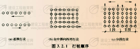 3.打樁順序:一般是由一端向另一端打;密集群樁由中心向四邊打;先打深樁,后打淺樁;先打坡頂,后打坡腳;先打靠近建筑的樁,然后往外打;遇到多方向樁應設法減少變更樁機斜度或方向的作業(yè)次數,并避免樁頂干擾。