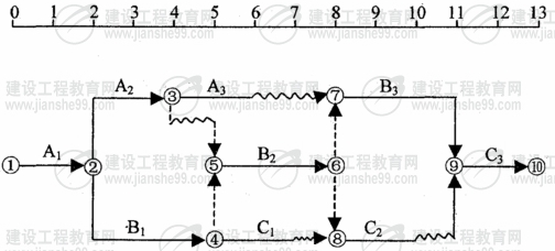 某承包商承建一基礎(chǔ)設(shè)施項(xiàng)目,其施工網(wǎng)絡(luò)進(jìn)度計(jì)劃如圖4-1所示。
