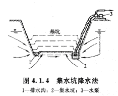 明排水法是在基坑開挖過程中,在坑底設置集水坑,并沿坑底周圍或中央開挖排水溝,使水流人集水坑,然后用水泵抽走(圖4.1.4)抽出的水應予引開,以防倒流。