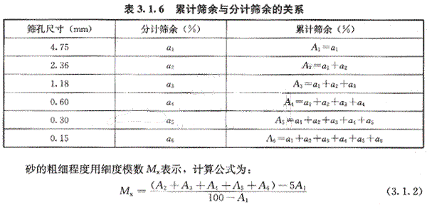 篩分析法是用一套孔徑為4.75mm、2.36mm、1.18mm、0.60mm、0.30mm和0.15mm的標(biāo)準(zhǔn)方孔篩的,按照篩孔的大小順序,將用9.50mm方孔篩篩出的500g干砂,由粗到過(guò)篩,稱(chēng)得各號(hào)篩上的篩余量。并且計(jì)算出各篩上的分計(jì)篩余百分率a1、a2、a3、a4、a5和a6.(各篩上的篩余量占砂樣總重的百分率)及累計(jì)篩余百分率A1、A2、A3、A4、A5和A6(各號(hào)篩的分計(jì)篩余百分率加上大于該篩的分計(jì)篩余百分率之和),其關(guān)系見(jiàn)表3.1.6.