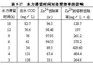 。2)水力滯留時間對反應(yīng)器穩(wěn)定性的影響在進水COD為320mg/L,鋅離子100mg/L的條件下逐漸提高進水速率。水力滯留時間由18h逐漸減少至3h,結(jié)果如表9-17。