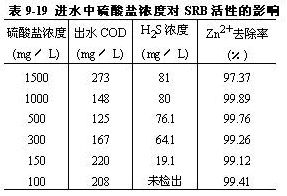 。4)進水硫酸鹽濃度對鋅離子去除率的影響試驗中為了避免干擾,進水COD濃度提高到640mg/L,結(jié)果見表9-19。由表9-19表明,該法在所試范圍內(nèi)對鋅離子的去除率均為97%以上。分析硫化氫濃度表明,SRB的活性受硫酸鹽濃度影響。在硫酸根濃度低于500mg/L時,SRB的活性隨著硫酸根濃度的降低而降低。至100mg/L時,出水中已經(jīng)測不到硫化氫,在該濃度下看來不能長期運行。由于一般的工業(yè)廢水中硫酸鹽的濃度都較高,因而硫酸鹽的濃度不會影響本方法的應(yīng)用。