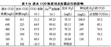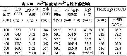 。1)進水COD濃度對鋅離子去除能力的影響進水COD濃度對鋅離子和COD去除能力的影響結(jié)果見表9-16。