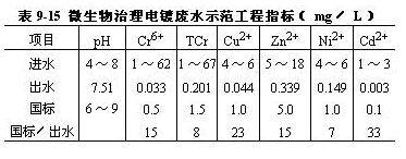 。3)出水水質(zhì)處理后排放水中六價鉻、總鉻、鋅、銅、鎳、鎘等金屬低于國家GB8978-1996污水綜合排放標(biāo)準(zhǔn),見表9-15。