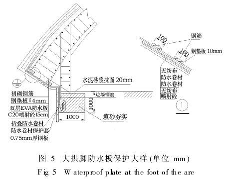二次襯砌采用先拱后墻法施工,為防拱腳處的壓力、襯砌鋼筋的安裝、邊墻爆破炸壞防水板,在拱墻結合部防水卷材要作特殊保護措施,在拱墻結合部位施作雙層防水卷材(如圖5),在拱腳砼底部挖槽(配合拱墻鋼筋連接用),將EVA卷入槽內,槽用砂回填,回填后用水泥砂漿抹平,防止灌砼時,砼漿液流入槽內,待邊墻開挖時,再撬掉砂漿層,將防水板從小槽內拉出,與邊墻防水板焊接,小槽寬100×100cm,沿隧道通長布置,防水板卷入小槽長度為30~50cm。同時,為使拱部二襯鋼筋與拱腳處防水板間的點接觸變?yōu)槊娼佑|,以防鋼筋刺穿防水板,對二襯環(huán)向主鋼筋增加兩塊10cm寬厚10mm的鋼墊板。