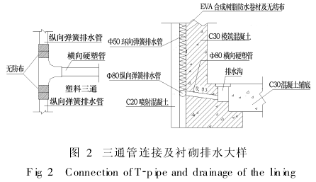 在隧道兩側墻腳初期支護與二次襯砌之間分別Φ80彈簧軟式透水管作為縱向排水,環(huán)向透水管與縱向透水管相接處采用三通管相連接,在縱向排水管與水溝之間用Φ80硬塑管相連(如圖2),使圍巖的裂隙水經(jīng)環(huán)向透水管、縱向排水管及橫向引水管引至隧道邊溝排出洞外。