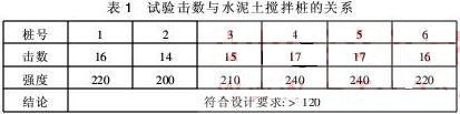 1)圓錐動力輕便觸探。根據(jù)《杭州市地鐵軟基處理規(guī)范》的規(guī)定,用動力輕便觸探水泥土攪拌樁的7d強(qiáng)度,且貫入深度不小于1.0m.試驗(yàn)擊數(shù)與水泥土攪拌樁的關(guān)系見表1。