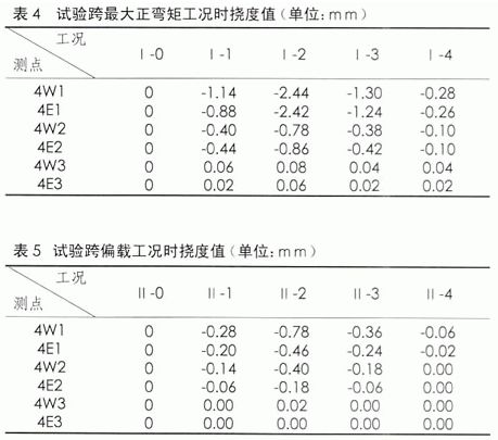 試驗跨撓度測試點位置,最大正彎矩工況時,其對應的撓度見表4;偏載工況時,載重車壓西側(cè),各控制點的撓度值見表5。