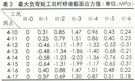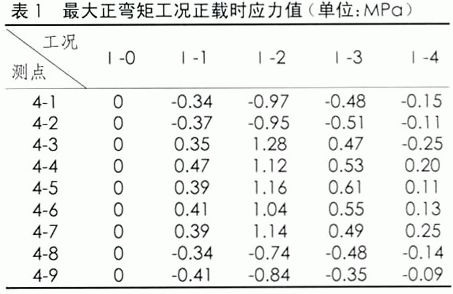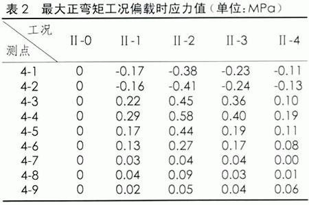 試驗跨跨中和橋墩位置應力測試點布置。試驗跨E62-E63跨中截面(1/2截面)在最大正彎矩工況時汽車擺放的位置,其對應的應力值見表1;偏載工況時,載重車壓西側(cè),各控制截面的應力值見表3-2.E62墩最大負彎矩工況時汽車擺放的位置,其對應的應力值見表2。