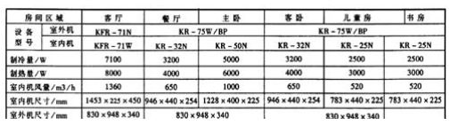 室內(nèi)機(jī)為卡式暗藏式,此機(jī)型高度僅225mm,它的安裝能帶來平滑、完美的室內(nèi)裝飾效果,對于居家生活保持和諧的氣氛來說是十分重要的?ㄊ桨挡厥娇照{(diào)可隨意選擇風(fēng)口形式,滿足房間布局和整體舒適感的需求。這種空調(diào)系統(tǒng)無水管連接,因此杜絕了水管因?yàn)榘惭b或保溫不良等問題而造成漏水的可能。由于小區(qū)供電為三相供電,為達(dá)到供電平衡,系統(tǒng)采用兩臺KR-75W/BP外機(jī),一臺KFR-71W外機(jī),以此達(dá)到供電平衡。具體見表1。