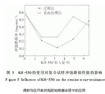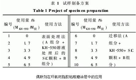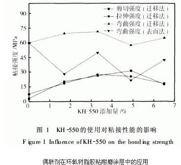 著重研究了在環(huán)氧膠粘涂層中加入偶聯(lián)劑KH-550對(duì)共混體系粘接強(qiáng)度(包括剪切強(qiáng)度、拉伸強(qiáng)度及彎曲強(qiáng)度)、耐磨性的影響,以便確定在膠粘涂層中較好的使用方法及最佳加入量。