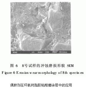 在復(fù)合涂層的沖蝕磨損過程中,膠體固化物的硬度比沖擊粒子低得多,極易磨損。隨膠體固化物的進(jìn)一步磨損,碳化硅顆粒的暴露面積不斷增大,在磨粒的不斷沖擊下,碳化硅顆粒與膠體的界面處將產(chǎn)生反復(fù)的變形,最終導(dǎo)致該處形成疲勞裂紋。裂紋的進(jìn)一步擴(kuò)展,必將引起碳化硅顆粒與復(fù)合層內(nèi)膠體的結(jié)合失效,致使碳化硅顆粒從膠體上脫落,形成凹坑,此為磨損的一個(gè)循環(huán)過程?梢娔z體與碳化硅顆粒間的界面結(jié)合強(qiáng)度對(duì)復(fù)合涂層的磨損速度有決定性影響,界面結(jié)合強(qiáng)度越大,在沖擊力下越不易失效,粒子脫落的可能性大大減小,因而復(fù)合涂層的磨損量越小。因此提高各相之間界面結(jié)合強(qiáng)度是提高復(fù)合材料耐磨性的關(guān)鍵因素。而偶聯(lián)劑則恰恰能很好地使膠體各組分相之間、無機(jī)填料及鋼基表面與所接觸的有機(jī)相之間牢固地粘合在一起,數(shù)據(jù)體現(xiàn)在各粘接強(qiáng)度得到很大提高上。