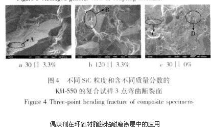 對(duì)比圖4a、圖4b及圖4c,添加KH-550的涂層斷面上,出現(xiàn)魚鱗層狀斷裂特性(如圖4中A、B處),說明在外界載荷作用下,復(fù)合材料沒有從粘接劑固化物與顆粒間斷裂,而是呈現(xiàn)典型的樹脂斷裂特征,證明界面結(jié)合良好,結(jié)合強(qiáng)度大于粘接劑自身強(qiáng)度;而未加KH-550的斷面上,在粘接劑固化物與SiC顆粒結(jié)合處有若干清晰裂紋(如C及D處),界面結(jié)合不良,如若施加外界載荷,這些裂紋極易沿原有方向擴(kuò)展,最終導(dǎo)致顆粒周圍得不到膠體的鑲嵌固定作用而脫落出來,造成涂層的失效。