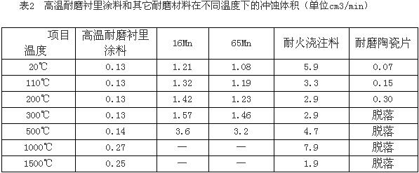 由表2可知:常溫高溫耐磨襯里涂料的耐磨性能是16Mn鋼的9倍、65Mn鋼的8倍、耐火澆注料的45倍,由于水泥行業(yè)設(shè)備使用的環(huán)境復(fù)雜,粉塵高速?zèng)_刷相互摩擦產(chǎn)生很多熱量,所以使用溫度大多在100~300℃之內(nèi),生料預(yù)熱系統(tǒng)和熟料輸送系統(tǒng)的溫度更高。這時(shí)候高溫耐磨襯里涂料的優(yōu)越性就充分表現(xiàn)了出來(lái),根據(jù)實(shí)驗(yàn)數(shù)據(jù)可知隨著使用溫度的提高高溫耐磨襯里涂料的耐磨性能變化很小。盡管陶瓷片的耐磨性變化小,但因其粘貼工藝制約了它的使用壽命(見(jiàn)下文分析)。